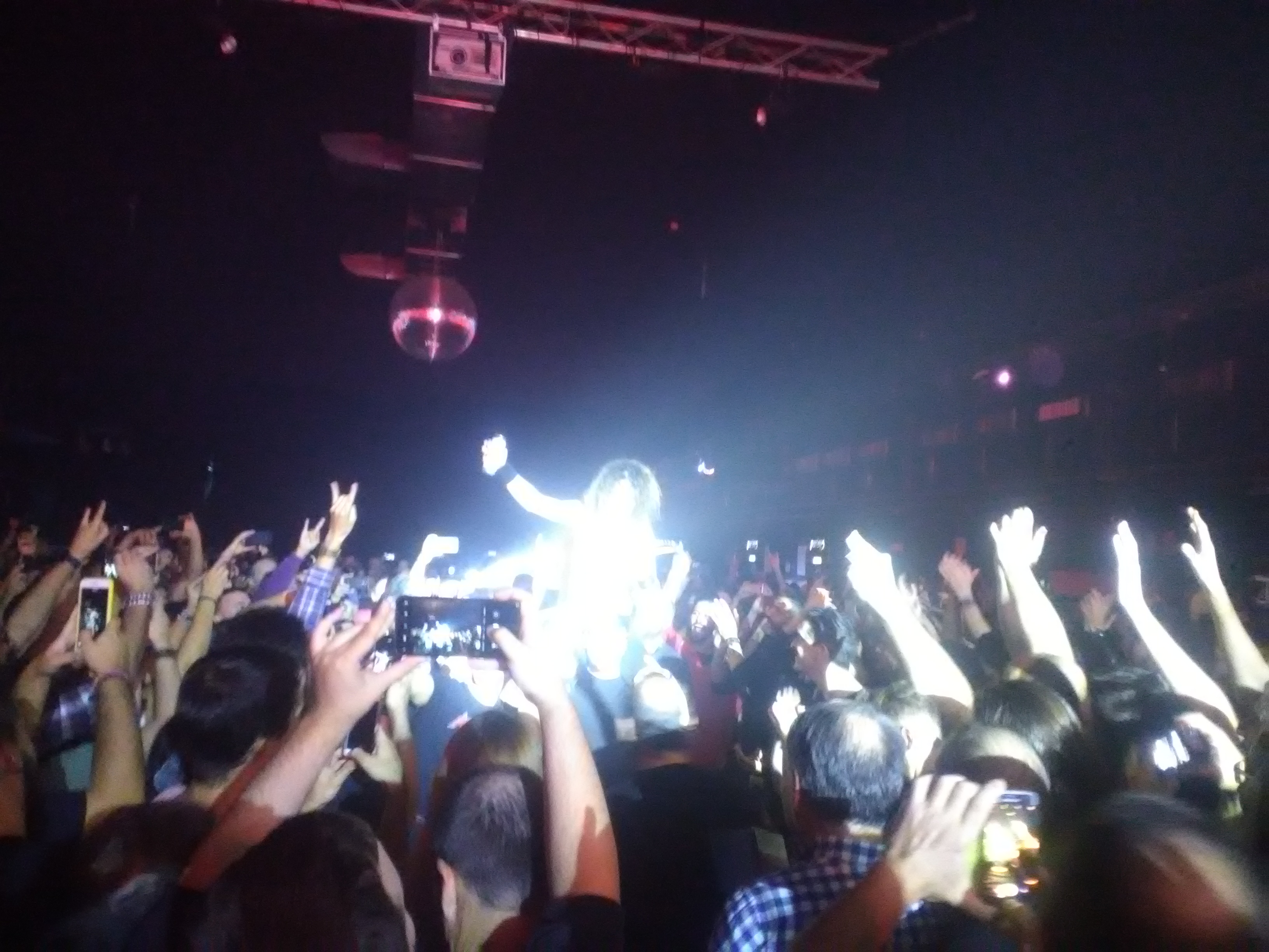Mientras nos daba tiempo a refrescarnos con la ya mítica cerveza que no puede faltar en los conciertos salía al escenario Joel O’Keeffe y los suyos, un escenario con amplificadores por todos lados dejando sólo un hueco para que se viese al batería, “Raise The Flag” y la locura comenzó, guiada siempe a la perfección por ese vocalista que no para en ningún momento de la actuación. La sala ya presentaba una imagen digna de un concierto de Rock como el que estábamos presenciando, además las masas que siguen a Airbourne son calientes, desde el primer instante no pararon de bailar y de corear sus temas. “Too Much, Too Young, Too Fast” ya fue la definitiva para el delirio colectivo. Este fulgurante inicio les sirvió también para presentar la nueva canción “Burnout The Nitro”, tema clásico Airbourne. “Back In The Game” y “Girls In Black”, dieron paso a un momento álgido para la banda y para el público entregado pues Joel O’keffe bajó al público a hombros de alguien y de una manera alocada se reventó una lata de cerveza en la cabeza con la que bañó a todos los que le rodeaban. La fiesta continuaba con “Bottom Of The Well”,“Breakin’ Outta Hell”, el show no paraba, luces, riffs, bailes, todo guiado a la perfección por los australianos.
