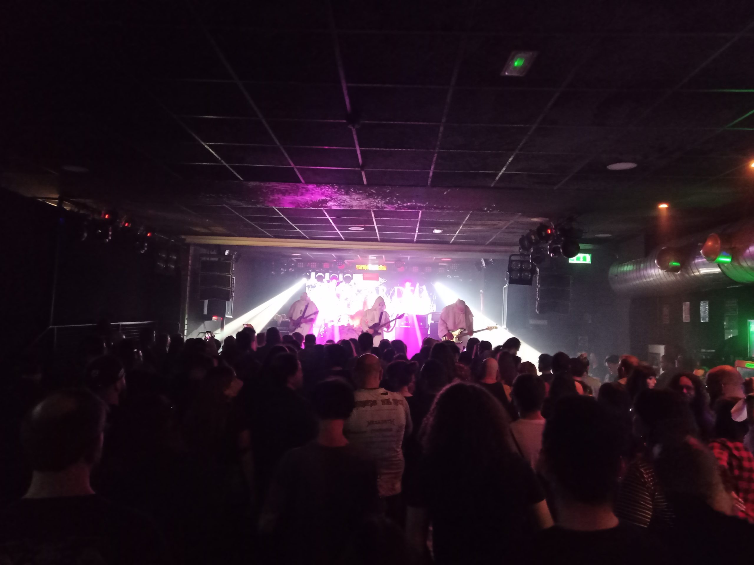 Finalmente, a eso de las 23:00, aparecían por fin los esperados músicos, para empezar a deleitarnos con sus descargas eléctricas. Nosotros, que estábamos justo delante del gran (de tamaño y de corazón) SkyBite, teníamos la sensación de que se le quedaba, literalmente, pequeño el escenario de la Garaje. Por cierto, muchísimas gracias por tener el cariñoso gesto con Carmen al regalarle la púa. Eternamente agradecidos con tu detalle. Pronto iba a empezar a dolerme el cuello, cuando ya no pude contenerme al oír la melodía de Because Evident (…), una canción que siempre disfruto como un enano. El respetable también empezaba a calentarse en lo que iba a ser una gran noche. Así se fueron sucediendo los trallazos uno tras otros, mientras los miembros de la banda animaban de lo lindo al público. El EP homónimo del grupo, con dos espléndidas piezas como son Crvcis y Rerrvrrectionem, envolvieron la sala de un sonido hipnótico, mas entre medias introdujeron una canción perteneciente a Trinidad, como es Caridad. Las canciones de este último lanzamiento ponían algo de pausa y serenidad al frenético derroche de las enérgicas descargas que nos caían encima.