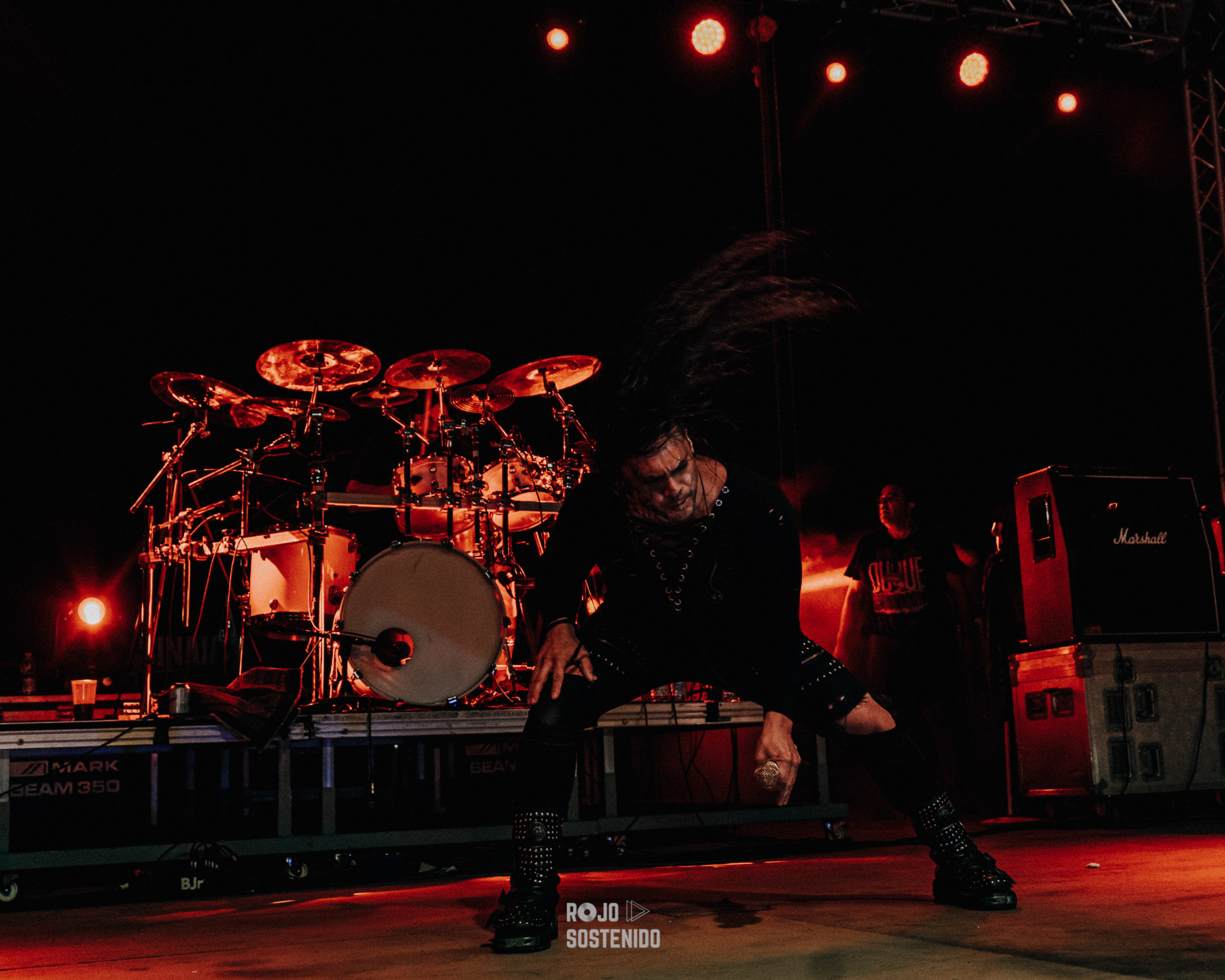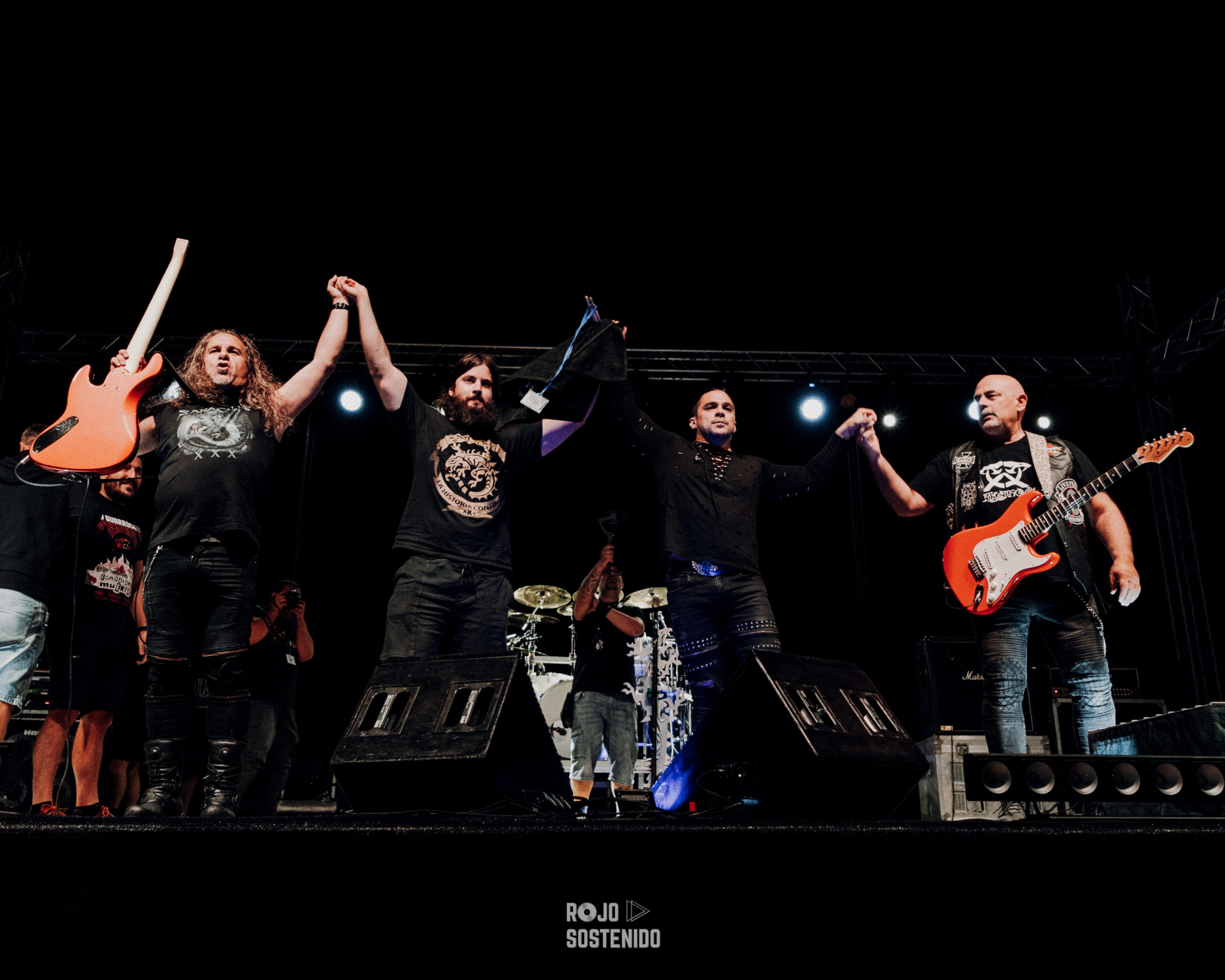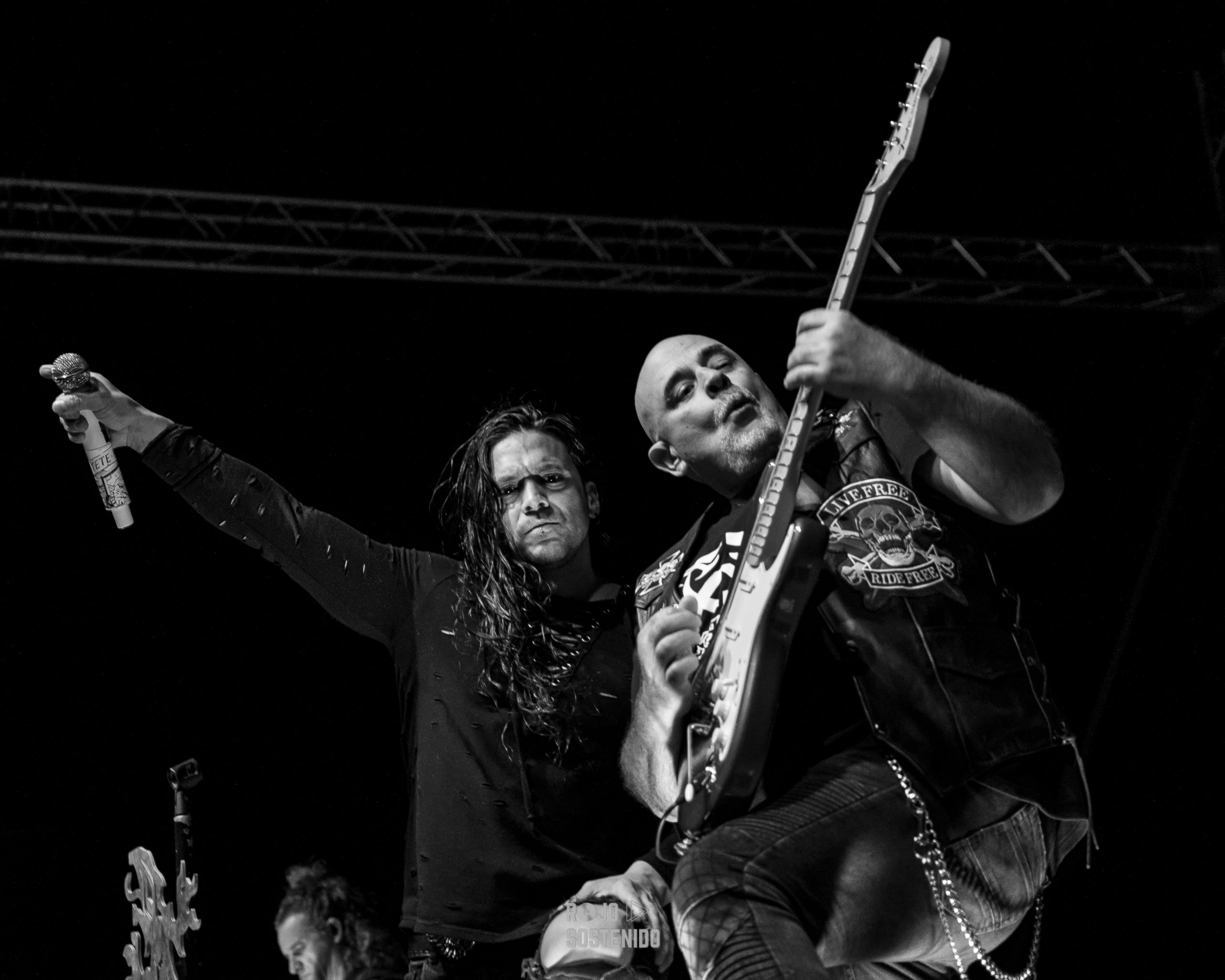 Los madrileños venían con un puñado de clásicos bajo el brazo y empezaron a descargarlos uno tras otro. A morir, no sufriré jamás por ti, maldito corazón. Casi nada. El entregado público levantaba sus cuernos y cantaba al son de un Tete Novoa muy animado e interactivo con nosotros, como acostumbra, y atronaba con su vozarrón haciendo retumbar los cimientos de la localidad malagueña. El vuelo del halcón y, una difícil de ejecutar como a sangre y fuego, con unas luces rojas que acompañaban a la perfección, continuaron un concierto de altos vuelos, de los grandes. El bajo de 5 cuerdas de Niko se la ponía morcillona a Tete, dicho por él. Ojito, que no solo al cantante.