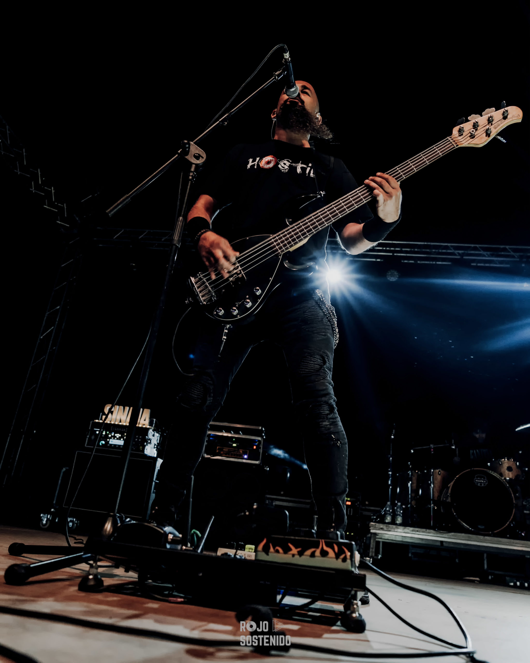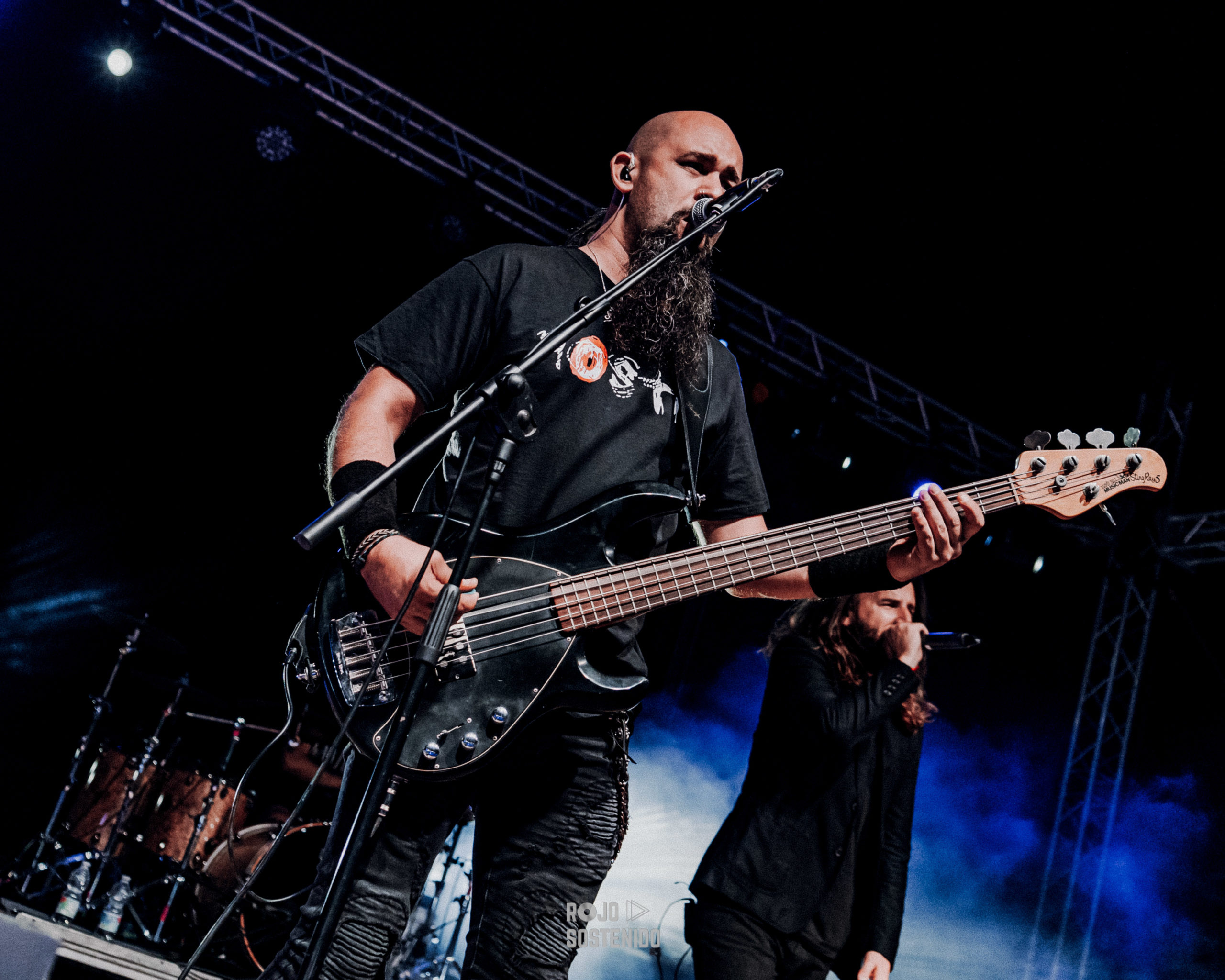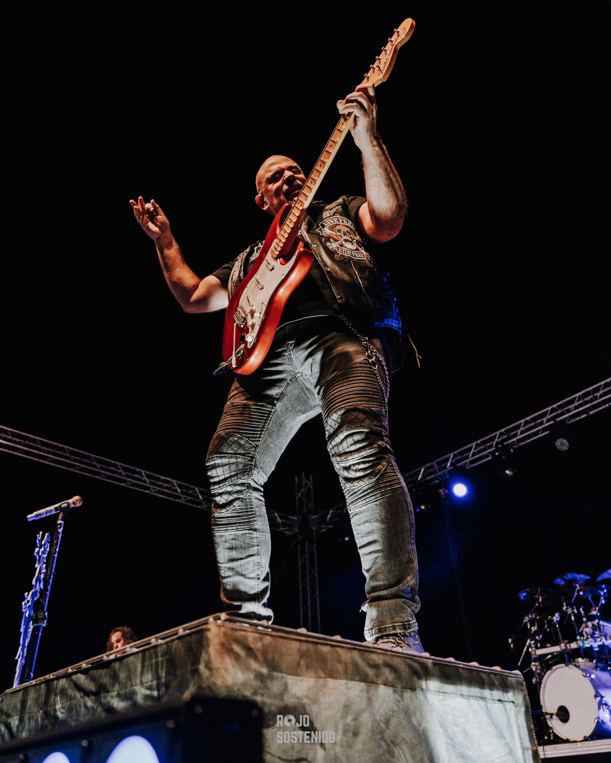 Los madrileños venían con un puñado de clásicos bajo el brazo y empezaron a descargarlos uno tras otro. A morir, no sufriré jamás por ti, maldito corazón. Casi nada. El entregado público levantaba sus cuernos y cantaba al son de un Tete Novoa muy animado e interactivo con nosotros, como acostumbra, y atronaba con su vozarrón haciendo retumbar los cimientos de la localidad malagueña. El vuelo del halcón y, una difícil de ejecutar como a sangre y fuego, con unas luces rojas que acompañaban a la perfección, continuaron un concierto de altos vuelos, de los grandes. El bajo de 5 cuerdas de Niko se la ponía morcillona a Tete, dicho por él. Ojito, que no solo al cantante.