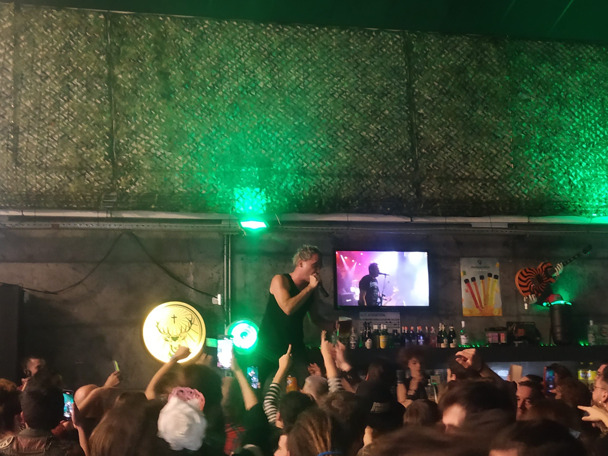 Los temas iban cayendo, los asistentes cada vez ,más entregados, las cervezas volaban… y llegó el momento álgido, Aitor se lanzaba al público que lo llevó en volandas de un lado a otro del recinto, le llovieron todo tipo de bebidas, él más feliz, parecía que volaba sobre nuestras cabezas.