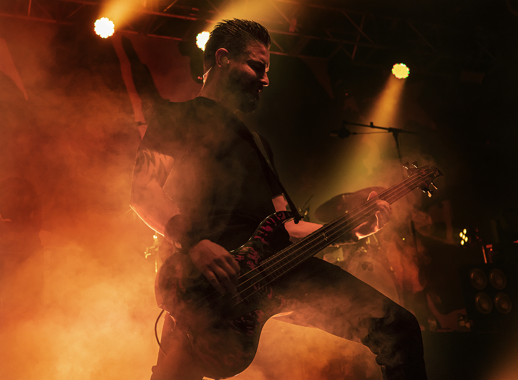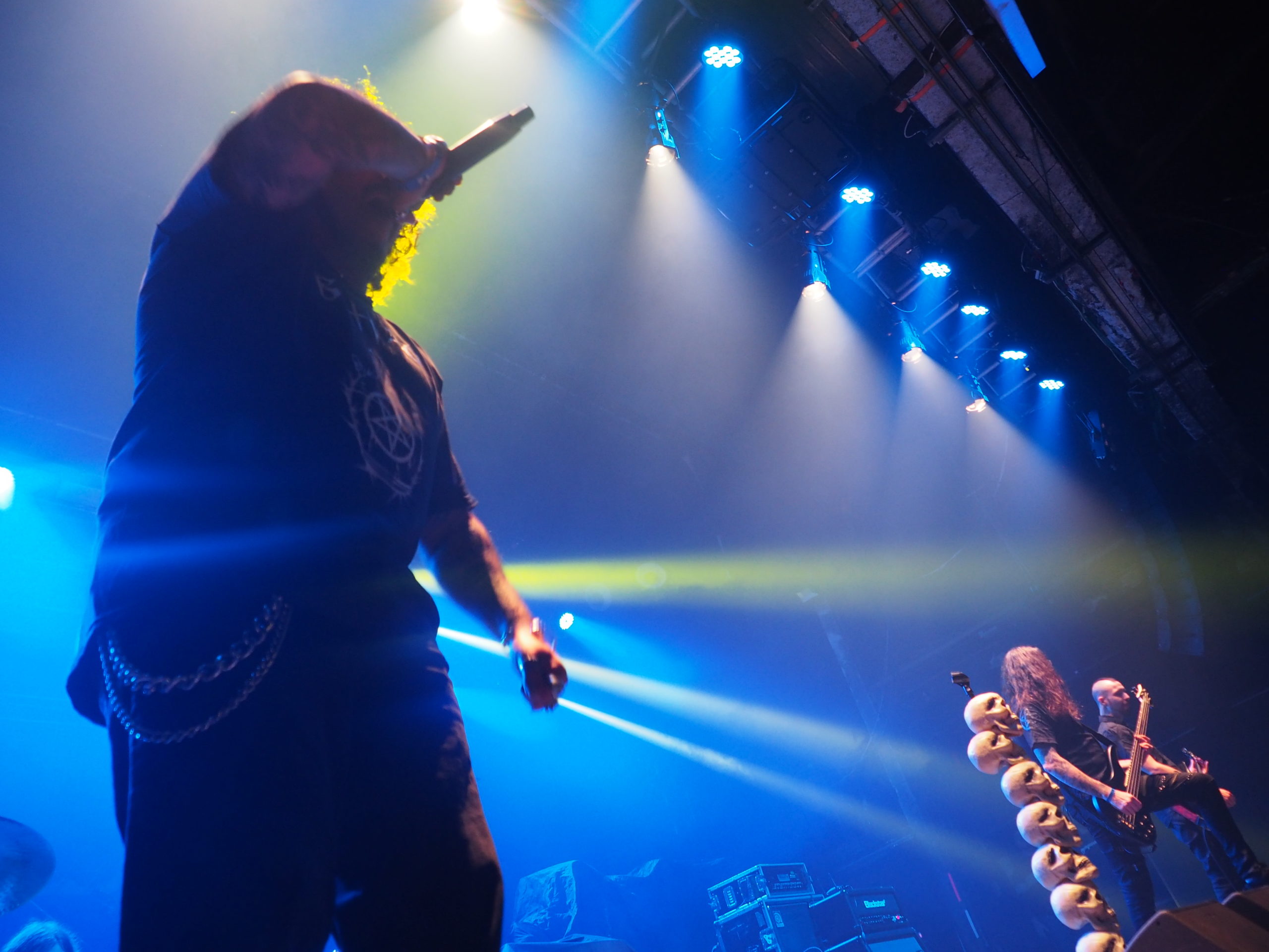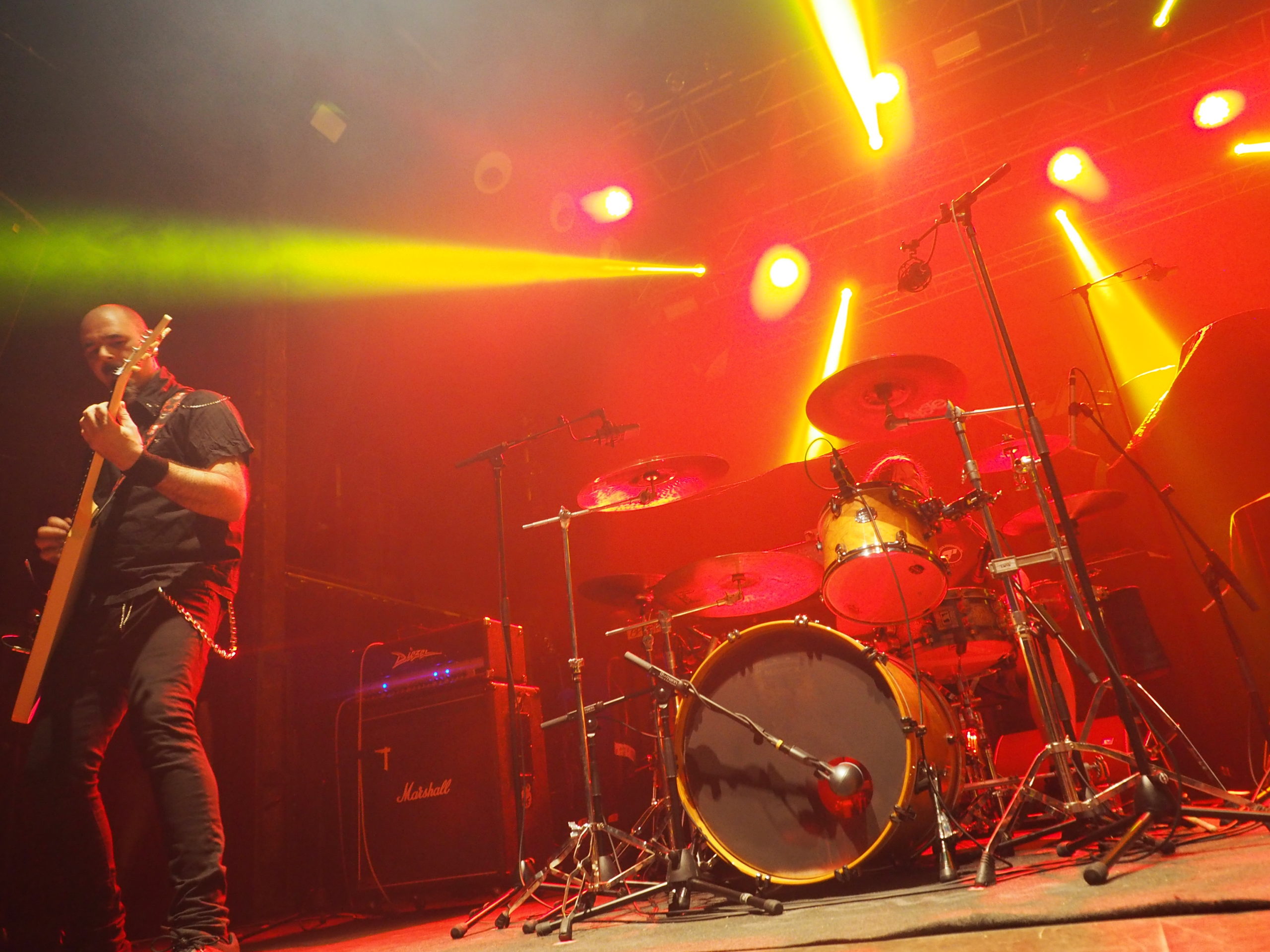 La ración thrash en este primer bloque se sirvió únicamente con “La política del miedo” y en la parte final desbarradisima y loca de “Sueños Rotos” donde hubo una buena liada en pista. Siguieron adelante con “Alienado” y su punto más ardor y la brutal “Tiempos Oscuros”, acompañada de toda la parafernalia de los cañones de humo y campanadas acompañando la liturgia. Cabe mencionar también la lapidaria e imponente “Niebla de Guerra”. Todo ello aderezado con la batería de luces ad hoc que se une al espectáculo con una combinación tremenda de flashes, colores y todo ello en sincronía con los golpes de la batería.