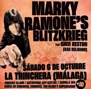 MARKY RAMONE, el mítico componente de una de las bandas punks más afamadas de todos los tiempos estará actuando en Málaga en la Sala La Trinchera el próximo 6 de octubre con su proyecto MARKY RAMONE’S BLITZKRIEG feat GREG HETSON ( BAD RELIGION).